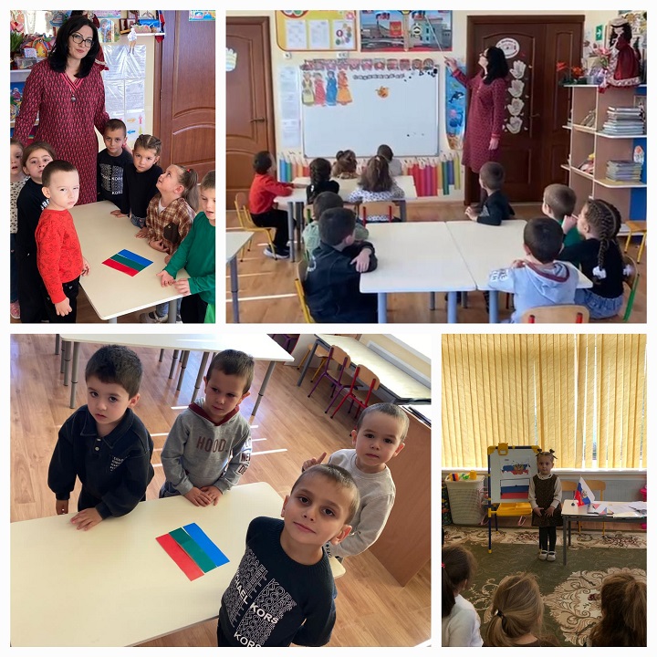 В рамках региональной инновационной площадки «Маленькие патриоты большой страны» 2 октября 2025 года в средних, старших и подготовительных группах «Детского сада «Аистенок» пгт Правокубанский, прошло занятие «Государственные символы России».