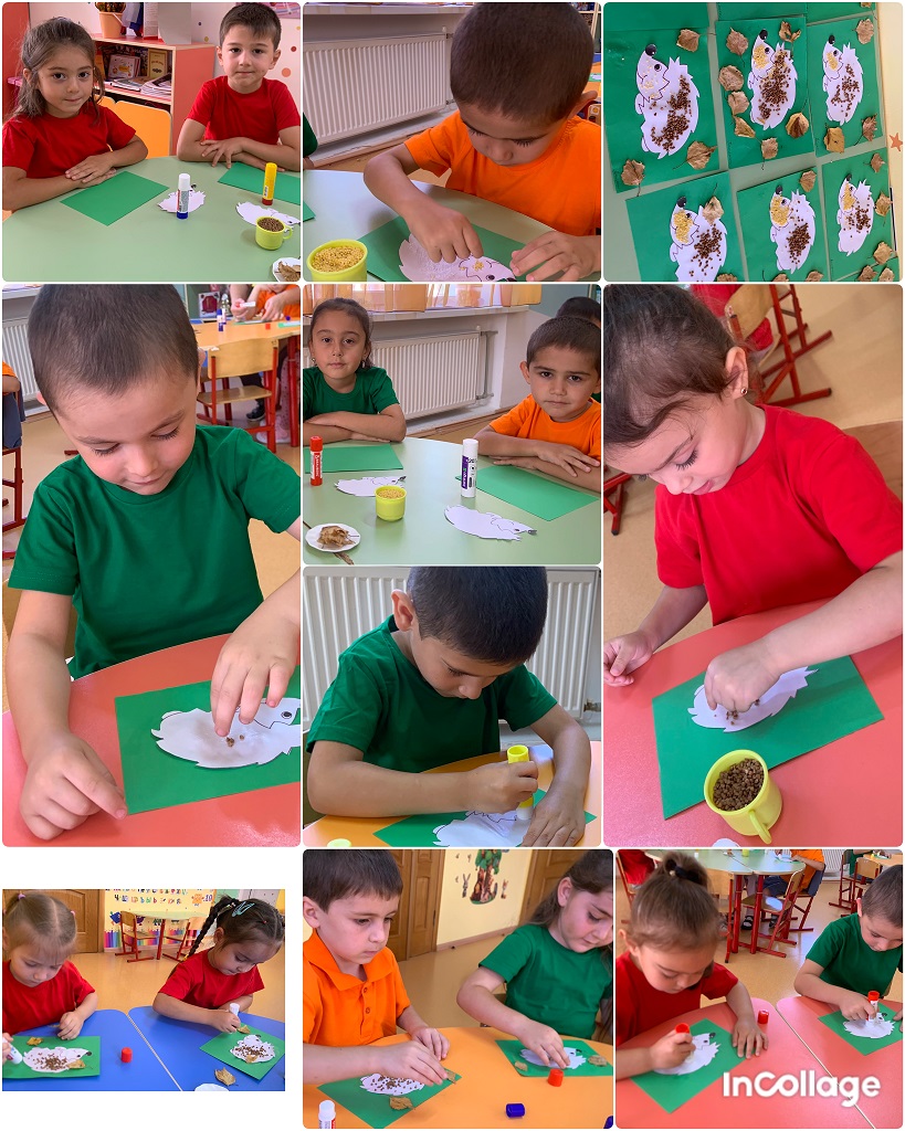 Воспитатель приветствует детей, рассказывает о лесном госте — ёжике и об осени, показывая готовый образец аппликации. Демонстрируя материалы: гречка и пшёнка как «колючки», сухие листья как обрамление, цветная бумага для фона, клей. Дети наклеивают силуэт ёжика на картон, затем формируют «шёрстку» из гречки и пшёнки, аккуратно прижимая зёрна, украшают композицию листьями. Воспитатель подсказывает технику выкладки, помогает при необходимости, побуждает детей придумывать историю про их ёжика. В конце занятия дети показывают свои работы и рассказывают, как назвали «гостя из леса».