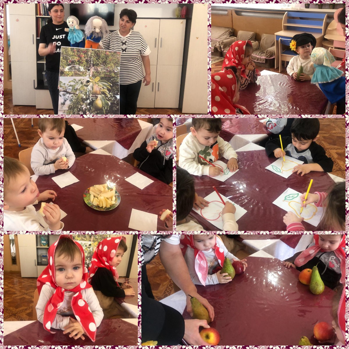 Сюрпризным моментом явилось появление кукольного театра: Бабушки и Дедушки, которые пригласили их в сад с грушами и яблоками. Дети рисовали фрукты, рассматривали их, сделали перерыв на музыкальную физминутку «Я в садочек пошла». Затем они сели за стол и Бабушка с Дедушкой угостили их сладкими яблоками и грушами.