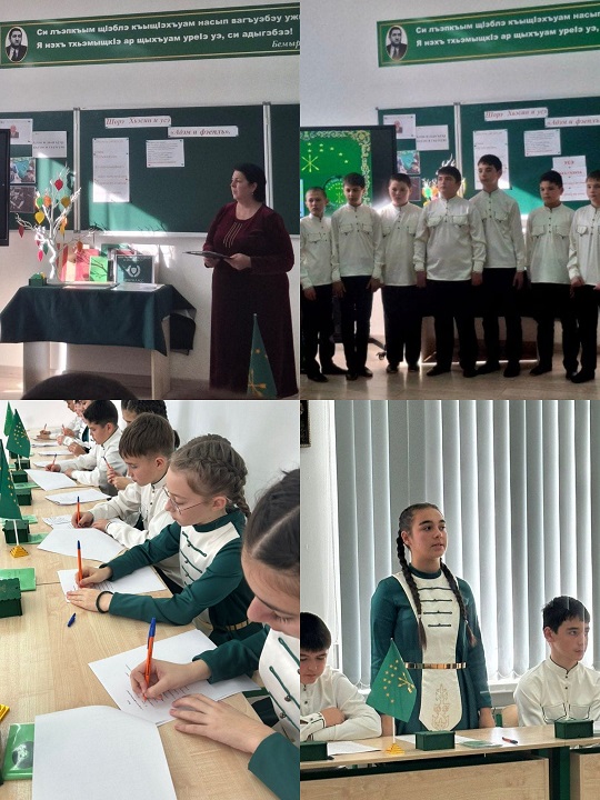 Хор «Вдохновение» исполнил композиции «У адыгов обычай такой», «Си бзэ — си псэ, си дуней!»задав атмосферу национального колорита и гордости за традиции народа. Учащиеся прочитали стихотворение Расула Гамзатова «Если ты Кунак» на двуязычии, . Произведение переведено на черкесский язык заслуженным учителем и народным поэтом Карачаево-Черкесской республики, членом Союза писателей России Мухадином Хамидовичем Бемурзовым.